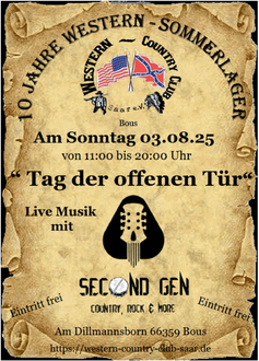 Der Western-Country-Club-Saar e.V. lädt herzlich zum Tag der offenen Tür ein, der Sonntag, dem 03.08auf dem Gelände des Turnvereins Bous stattfindet. Die Veranstaltung, die mittlerweile auf eine zehnjährige Tradition zurückblickt, ist fest im Veranstaltungskalender der Region verankert und erfreut sich wachsender Beliebtheit.