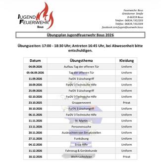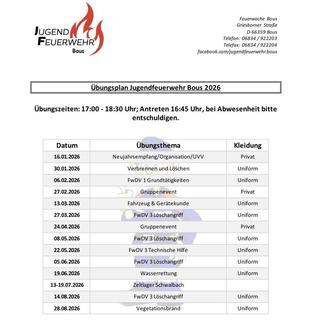 Wir beginnen am 16.01.206 wieder mit unserem wöchentlichen Übungsbetrieb. Los geht es immer freitags ab 17:00 Uhr am Feuerwehrgerätehaus Bous.