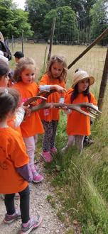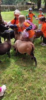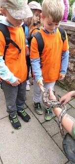 Dort angekommen wurden wir von 2 Tierpflegern erwartet, die uns schöne Einblicke in die heimische Tierwelt gewährten. So staunten die Kinder sehr, wie schwer ein Geweih ist, das der Hirsch auf dem Kopf trägt. Große Freude bereitete es allen, die Wildschweine mit Kartoffeln zu füttern. Danach ging es zu den Ziegen, für die wir einen Eimer Gerstenkörner bereitgestellt bekamen. Da die Ziegen ziemlich wild umherliefen, hatten einige Kinder zuerst Berührungsängste, die sich aber schnell verflüchtigten, denn die Ziegen waren eigentlich sehr lieb. Der Höhepunkt der Führung war das Streicheln der Königspython. Ihr habt euch alle getraut!