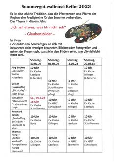 Am 30.Juli 2023 startet wieder die Predigtreihe in der Region unter dem Titel „Ich sehe was, was ich nicht sehe - Glaubensbilder“. Es wird wieder sehr interessant, denn die Pfarrer und Pfarrerin haben sich einiges dazu einfallen lassen. Sie sind herzlich dazu eingeladen.