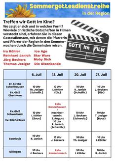 Auch in diesem Jahr haben wir wieder die Predigtreihe in der Region unter dem Titel „Gott im Film“. Sie endet am Sonntag, 03.08.2025 mit dem Gottesdienst in Schwalbach und dem Film „Star Wars“.