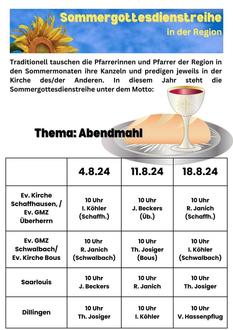 Auch in diesem Jahr haben wir wieder die Predigtreihe in der Region unter dem Titel „Abendmahl“. Es wird wieder sehr interessant, denn die Pfarrer und Pfarrerin haben sich einiges dazu einfallen lassen. Sie sind herzlich dazu eingeladen.