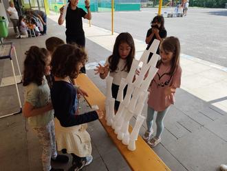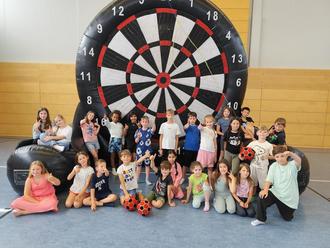 Kein Glück mit dem Wetter – doch das Beste draus gemacht! Ein großer Dank geht an dieser Stelle an Björn Steinmetz, der uns für die ersten zwei Ferienwochen zwei Hüpfburgen und ein Fußballdart zur Verfügung gestellt hat. So konnten wir die Turnhalle in unsere eigene Kids-World verwandeln und dem schlechten Wetter trotzen. Aber auch kreativ waren wir fleißig, mit einem selbst gestalteten Holz-Memory.