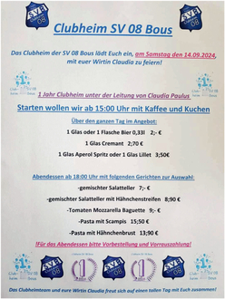 Der SV 08 Bous e.V. lädt herzlich zur Feier des einjährigen Bestehens des Clubheims unter der Leitung von Claudia Paulus ein.