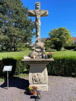 Was der kulturhistorischen Bedeutung und der Würde dieses kostbaren Denkmals jedoch völlig abträglich ist, sind die sicher wohlgemeinten aber völlig unpassenden Gegenstände, die auf dem Podest und vor dem Kreuz abgestellt sind. Wie den Fotos zu entnehmen ist, haben einige Behältnisse bereits Spuren auf der Steinfläche hinterlassen.