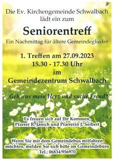 Die Ev. Kirchengemeinde Schwalbach lädt ein zum 1. Seniorentreff am 27.09.2023 im Gemeindezentrum in Schwalbach. Es ist ein Nachmittag für ältere Gemeindeglieder. Beginn ist um 15.30 Uhr und enden wird der Nachmittag um 17.30 Uhr. Es besteht die Möglichkeit mit dem Gemeindebus zu kommen. Wenn Sie diese nutzen möchten, melden Sie sich bitte telefonisch im Gemeindebüro unter 06834/956970.