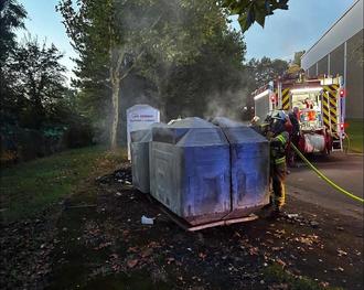 Ein Trupp unter Atemschutz mit Schnellangriff zur Brandbekämpfung. Papiercontainer im Anschluss mittels Schaumteppich vollständig bedeckt. Kontrolle mittels Wärmebildkamera.