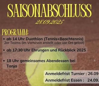 Am Sonntag, dem 29. September, findet der jährliche Saisonabschluss auf unserer Tennisanlage statt, in dem wir gemeinsam die vollendete Sommersaison 2025 feiern.