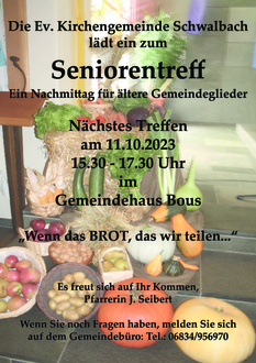 Die Ev. Kirchengemeinde Schwalbach lädt ein zum Seniorentreff am 11.10.2023 im Gemeindehaus in Bous, Weizenhübelstraße 3. Es ist ein Nachmittag für ältere Gemeindeglieder. Beginn ist um 15.30 Uhr und enden wird der Nachmittag um 17.30 Uhr.