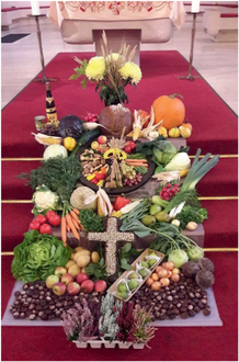 Frau Marga Hans mit ihrem „Team“ vom Elisabethen-Verein übernahm wieder die ehrenvolle Aufgabe, eine große Auswahl von Feld- und Gartenfrüchten vor dem Altar ansprechend zu arrangieren. Der Verein setzt damit die liebgewordene Tradition der vergangenen Jahre fort.