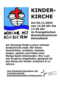 | 14.30 Uhr | – 17.30 Uhr Kinderkirche in Schwalbach |