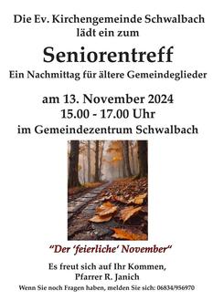 Am Mittwoch, den 13. November laden wir Sie wieder zum Seniorentreff im evangelischen Gemeindezentrum in Schwalbach ein. Es wird ein schöner Nachmittag für ältere Gemeindeglieder. Beginn ist um 15.00 Uhr und enden wird der Nachmittag um 17.00 Uhr. Thema an diesem Nachmittag wird sein: „Der feierliche November“