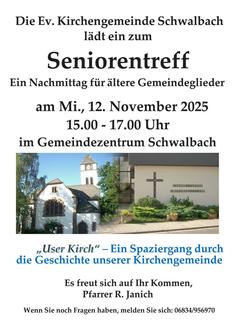 | 15:00 - 17:00 Uhr | Seniorentreff im Gemeindezentrum Schwalbach |