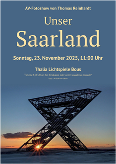 Die neue AV-Fotoschau von Thomas Reinhardt ist eine Liebeserklärung an das schönste Bundesland der Welt. Unser Saarland präsentiert zunächst die Themen Bergbau und Stahlindustrie, die unser Bundesland geprägt haben und mit ihren Folgelandschaften auch weiterhin präsent sind. Dann widmet sich die rund 90-minütige Multimedia-Reportage mit ausgesuchter Musik und Live-Kommentar der faszinierenden Natur und weiteren Themen. Die Mittelgebirgslandschaft ist sehr abwechslungsreich: Prächtige Landschaften, Seen, Weiher und Flüsse, Wälder, Wiesen und Felder, Berge, Burgen und Landmarken sowie reizvollen Pflanzen und Tieren. Und die Saarländerinnen und Saarländer wissen auch zu feiern, von der Fastnacht über Konzerte bis zu diversen Festivals. Dazu gehört natürlich auch das leibliche Wohl, vom Dibbelabbes bis zur Sterneküche.
