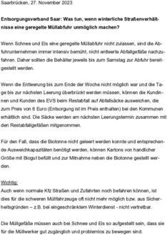 Wenn die Entleerung bis zum Ende der Woche nicht möglich war und die Tage bis zur nächsten Leerung überbrückt werden müssen, können die Kundinnen und Kunden des EVS beim Restabfall auf Abfallsäcke ausweichen, die zum Preis von 6 Euro (Entsorgung ist im Preis enthalten) bei den Kommunen erhältlich sind. Die Säcke werden am nächsten Leerungstermin zusammen mit den Restabfallgefäßen mitgenommen.