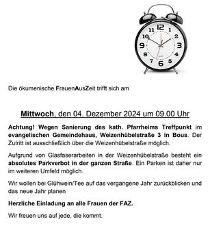 | 9.00 Uhr | FrauenAusZeit im Gemeindehaus Bous |