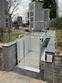 Auf dem Friedhof wurde ein weiterer Schritt zur Barrierefreiheit verwirklicht. Das Urnenstelenfeld ist nun ohne die Notwendigkeit, Treppenstufen zu gehen, erreichbar. Zwischen Einsegnungshalle und dem Stelenfeld wurde ein Lift installiert. Damit ist es nun auch für Menschen, die auf einen Rollstuhl oder Rollator angewiesen sind, möglich, ohne fremde Hilfe zu den Urnenstelen zu gelangen.