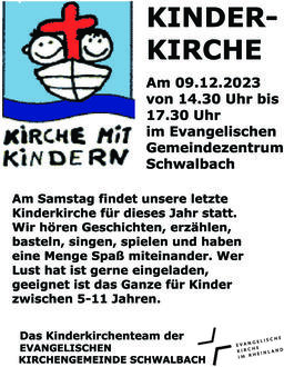 | 14.30 – 17.30 Uhr | Kinderkirche in Schwalbach |