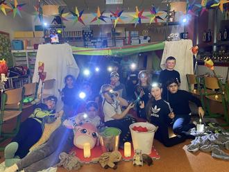 Wie auf vielen Plakaten zu lesen war, fand am Freitag, dem 29.11.24 die bundesweite ARD-Kinderradionacht statt. Auch bei uns machte sich eine Klasse abends um 18 Uhr auf den Weg in die Schule, um diese Veranstaltung gemeinsam zu erleben. Das diesjährige Motto hieß “Grölen in Höhlen” und so verwandelte die Klasse 3.4 mit Frau Leiner ihren Klassenraum in eine riesige Höhle, um den Mittelpunkt der Erde zu bereisen und weitere Abenteuer zu erleben. Ausgerüstet mit Taschenlampen, Kuscheldecken und Kissen wurde die Höhle erobert und den spannenden Radiogeschichten gelauscht. Außerdem wurde gesungen, getanzt und gespielt. Am Ende um 22:30 Uhr waren sich alle einig: Schule am Abend bei der Kinderradionacht ist der Hit!