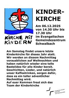 | 14:30 Uhr | – 17:30 Uhr Kinderkirche in Schwalbach |