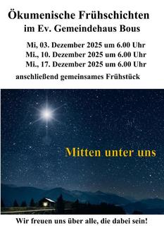 | 06:00 Uhr | Ökumenische Frühschicht im Ev. Gemeindehaus Bous |