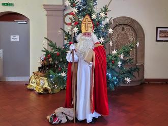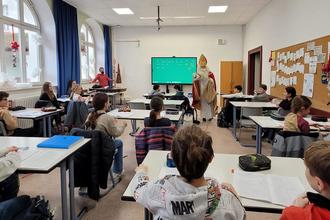 Laut klopfte es an die Klassentüren der fünften Klassen. Als diese geöffnet wurden, staunten die Schülerinnen und Schüler nicht schlecht, denn sie hatten nicht damit gerechnet, dass der Nikolaus sie am Nikolaustag besuchen würde. Sehr erfreut war der Nikolaus darüber, dass die Schülerinnen und Schüler gut über ihn Bescheid wussten. So konnten sie erzählen, woher der Nikolaus kam, welche Legenden es von ihm gibt und sangen ein Lied für den heiligen Mann. Natürlich hatte der Heilige Nikolaus auch eine kleine Süßigkeit für die Schüler dabei, die er ihnen gekonnt zuwarf. Anschließend besuchte der Nikolaus auch das Sekretariat, den Hausmeister und das Lehrerzimmer. Überall wurde er genauso freudig empfangen wie in den Fünferklassen.