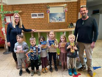 Gemeinsam mit den Kindern wurde das Thema „Teilen wie St. Martin“ erarbeitet, ein Plakat angefertigt, welches im Eingangsbereich der Kita aufgehängt wurde. Gesammelt haben wir unter anderem haltbare Lebensmittel wie zum Beispiel Reis, Mehl, Zucker, Nudeln, Gewürze, Öl, Tee, Konserven für bedürftige Menschen in unserer Gemeinde. Innerhalb kürzester Zeit kamen viele Spenden zusammen, die wir mit Hilfe der Kinder den Vertretern der „Aktion Lebensmittelkorb“ übergeben konnten.