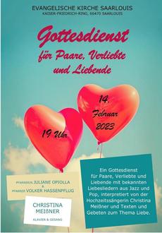 Gottesdienst für Liebende…jeder und jede liebt etwas, ob Menschen, Tiere, Pflanzen… oder was auch immer. Jeder und jede ist eingeladen. Ein Gottesdienst mit Liebesliedern aus Jazz und Pop und Texten über das Lieben und den liebevollen Blick Gottes: „Jemanden zu lieben, heißt, ihn mit Gottes Augen zu sehen.“