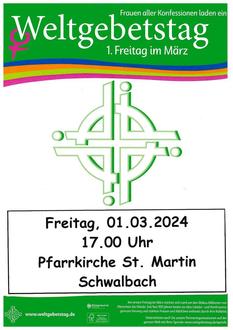 | 17.00 Uhr | Katholische Kirche St. Martin Schwalbach zum Weltgebetstag |