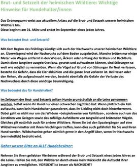 Nehmen Sie ihren geliebten Vierbeiner während der Brut- und Setzzeit eines jeden Jahres an die Leine. Helfen Sie mit, den Wildtieren durch etwas mehr Rücksicht die Aufzucht ihrer Jungtiere zu ermöglichen.