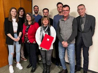 v.l.n.r.: Florine Fuge, Mika Fuge, MdL Tanja Hartdegen, Bürgermeister Daniel Iliev, Lukas Diebener, Jubilarin Susanne Pfromm, Michèl Patryas, Frank Roth, Alfred Rost