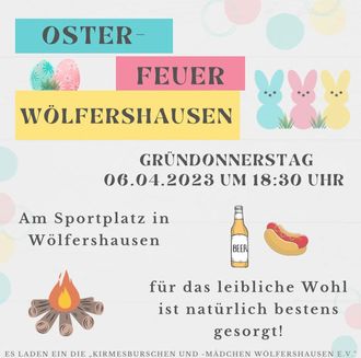 Die Kirmesgesellschaft Wölfershausen e.V. lädt ihre Gäste am kommenden Gründonnerstag den 06.04.2023 ab 18.30 Uhr zum Osterfeuer auf dem örtlichen Sportgelände ein.