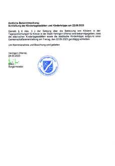 Gemäß § 6 Abs. 3 c der Satzung über die Betreuung von Kindern in den Tageseinrichtungen für Kinder in der Stadt Heringen (Werra) wird bekanntgegeben, dass die städtischen Kindertagesstätten sowie die städtische Kinderkrippe aufgrund einer Gemeinschaftsveranstaltung am Freitag, den 22.09.2023 ganztägig schließen.