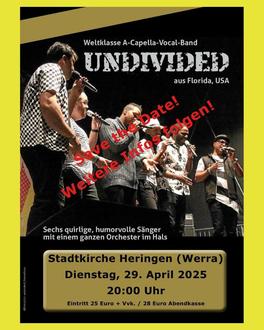 Die Weltklasse A-Capella-Vocal-Band UNDIVIDED aus Florida kommt zu uns am Dienstag, den 29. April 2025 in die Stadtkirche nach Heringen (Werra). Das Konzert beginnt um 20 Uhr.
