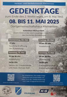 Der Heimat- und Verkehrsverein Kleinensee lädt die interessierte Bevölkerung zu den Gedenktagen „80 Jahre Frieden – Nie wieder Krieg“ anlässlich des 80. Jahrestages der Kapitulation der Deutschen Wehrmacht und dem Ende des entsetzlichen Zweiten Weltkrieges zu einer Ausstellung vom 08.-11.05.2025 nach Kleinensee ein.