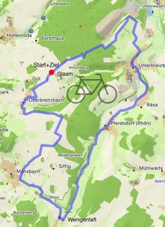 Start ist um 10.30 Uhr am Freizeitgelände des „Heimatvereins 400 Jahre Glaam“. Von dort geht es zunächst Richtung Osten nach Unterbreizbach und dann auf dem Ulstertal-Radweg bis Wenigentaft. Nach einer angemessenen Pause biegt die Route in den „Hohenroda-Radweg“ ein auf Mansbach zu und weiter über Oberbreitzbach wieder nach Glaam zurück.