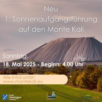 Beginnen Sie den Tag mit einem unvergesslichen Erlebnis und begleiten Sie uns auf eine besondere Sonnenaufgangsführung auf den Monte Kali in Heringen (Werra). Früh am Morgen, noch vor Sonnenaufgang, besteigen wir gemeinsam den 100 Meter hohen Hügel, um den Himmel in den schönsten Farben erstrahlen zu sehen.