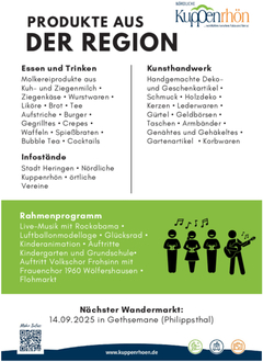 Der Kuppenrhöner Wandermarkt ist mehr als nur ein Markt – er ist ein Treffpunkt für alle, die die Region und ihre Traditionen feiern möchten. Gemeinsam mit der Heringer Kirche werden während des Marktes auch kleine Andachten und Besichtigungen angeboten, die dem Fest eine besondere spirituelle Note verleihen. Für die Kleinen gibt es zudem ein buntes Programm mit Spielen und Aktivitäten, sodass auch sie den Tag in vollen Zügen genießen können.