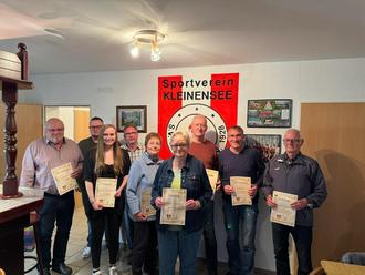 Langjährige Mitglieder wurden in der Mitgliederversammlung SV Kleinensee geehrt: v. l. Bernd Maus (Ehrenmitglied), Sebastian Schubert (2. Vorsitzender), Aline Ellenberger (25 JJahre), Wilfried Schade (Ältestenrat), Elke Spörer (50 Jahre), Marion Engelhardt (50 Jahre), Timo Schäfer (50 Jahre), Thomas George (Ehrenmitglied), Karl-Heinz Bein (15 Jahre)