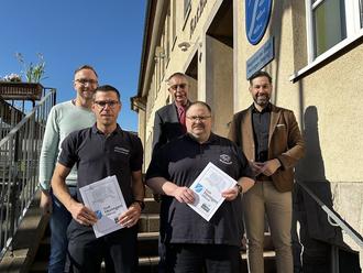 (Bild: v.l.n.r. Kai Adam Leiter Fachbereich 2, Marc-Daniel Möller stellvertretender SBI, Stadtverordnetenvorsteher Alfred Rost, SBI Duncan Stern, Bürgermeister Daniel Iliev)