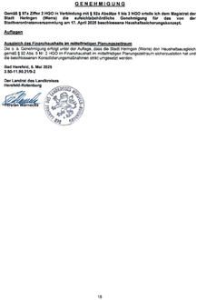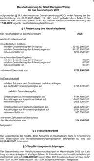 Die durch die Stadtverordnetenversammlung der Stadt Heringen (Werra) am 17.04.2025 beschlossene Haushaltssatzung für das Haushaltsjahr 2025 sowie die erforderlichen Genehmigungen werden gemäß § 97 (4) der Hessischen Gemeindeordnung hiermit öffentlich bekannt gemacht.