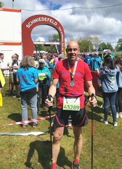 Thorsten Fey startete beim Rennsteiglauf um 08:40 zusammen mit circa 1500 Nordic Walker und Wanderer auf die 17,4 Km lange Strecke von Oberhof, nach Schmiedefeld. Von Anfang an setzte sich eine Gruppe von 8 Nordic Walkern vom Hauptfeld ab, Thorsten lag bis 4 Km vorm Ziel noch auf Position 6, konnte das Tempo aber nochmal anziehen und einen tollen 3. Platz erwalken,. 02:05,39 Std. benötigte er für die 17,4 Km Strecke mit knapp 300 Höhenmetern.