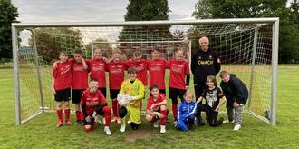 hinten v.l.n.r.: Jonas Mötzing, Leon Heyer, Naya Koch, Leif Wilm, Lias Fritsch, Semen Amonov, Ayda Koch, Trainer Dieter Litz | vorn v.l.n.r. Luis Stoll, Elias Schäfer [TW], Linus Licht sowie die F-Juniorenunterstützung Lia Koch, Emil Schäfer und Benluca Fritsch