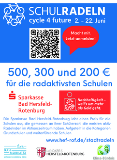Wie auch schon im Jahr 2023 werden die radaktivsten Grundschulen und weiterführenden Schulen im Landkreis ausgezeichnet. Die Sparkasse Hersfeld-Rotenburg lobt einen Preis (Platz 1: 500 Euro, Platz 2: 300 Euro, Platz 3: 200 Euro) für die Schulen aus, die gemessen an der ihrer Schülerzahl die meisten aktiv Radelnden im Aktionszeitraum haben.