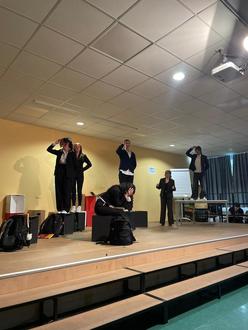 Nach einer kurzen Pause präsentierte der Kurs „Darstellendes Spiel“ aus der E-Phase das Stück „Zwischen Erwartungen und Träumen“, eine Hommage an „Der Club der toten Dichter“. Ihre Darbietung zeigte eindrucksvoll, wie Schülerinnen und Schüler täglich zwischen eigenen Träumen und Erwartungen stehen und wie herausfordernd das Erwachsenwerden sein kann. Diese sensible und tiefgründige Auseinandersetzung mit den Herausforderungen des Alltags fand großen Anklang beim Publikum und regte gleichzeitig zum Nachdenken an.