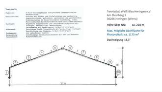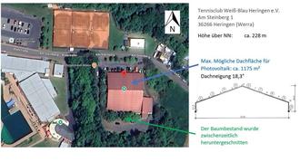 Der Magistrat der Stadt Heringen (Werra) stellt im Einvernehmen und in enger Abstimmung mit dem Tennisverein Weiß-Blau Heringen e.V. die Dachfläche der Tennishalle zur langfristigen Vermietung/Verpachtung für eine Photovoltaikanlage zur Verfügung. Derzeit ist der Tennisverein über einen Erbbaurechtsvertrag mit der Stadt Eigentümer des aufstehenden Gebäudes und besitzt sowohl Rechte, als auch Pflichten für Grundstück und Gebäude. Die Tennishalle wurde 1993 errichtet. Das Dach wurde mit Leimholzbindern auf Stahlträgern erstellt und mit einer Dachbeblechung versehen.