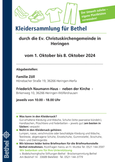 In der Zeit vom 01.10. bis 08.10.2024 findet wieder die Altkleidersammlung für Bethel statt.