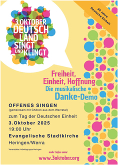 Die Initiative „3.Oktober – Deutschland singt und klingt“ lädt auch 2025 wieder alle Generationen und Kulturen zum offenen Singen und Feiern ein. Wie bereits in den letzten Jahren findet die zentrale Veranstaltung für das Werratal erneut in der Stadtkirche Heringen statt. Bietet doch die modern gestaltete und mit einer wunderschönen Akustik versehene Kirche, Platz für nahezu 600 Personen.
