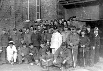 Es zeigt Männer und Frauen in Arbeitskleidung und teils mit alten Grubenlampen. Ob es die Belegschaft des Werkes ist oder eine Besuchergruppe?