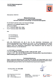Bekanntmachung der Ergebnisse von Liegenschaftsvernessungen nach dem Hessischen Vermessungs- und Geoinformationsgesets